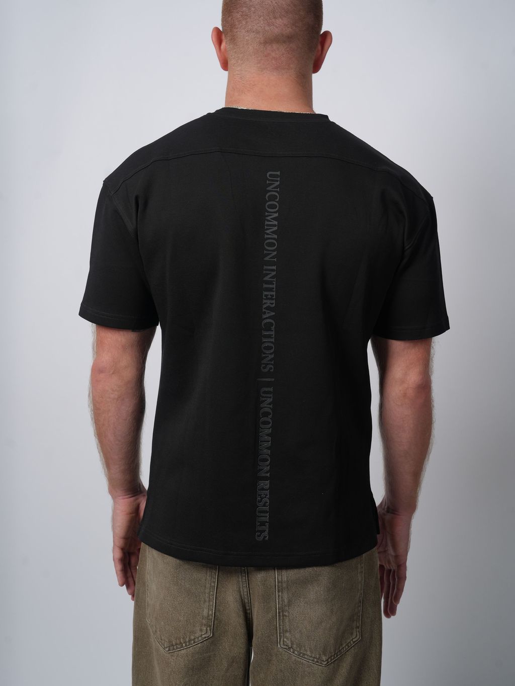 This version makes a bold, intentional statement with “Be Uncommon” printed vertically along the front left hem, and “Uncommon Interactions | Uncommon Results” printed vertically down the back spine — a reflection of the mindset behind the brand.